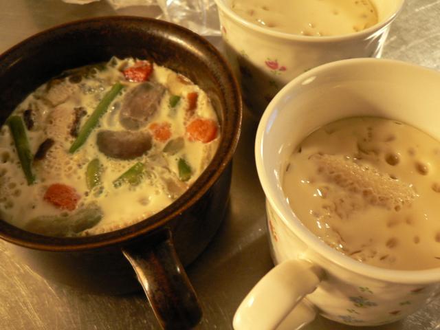 ■先程買ってきた「干し椎茸」を水で戻して、作ってみました、「茶碗蒸し」。蒲鉾も海老も入っていませんが、wok(一応、木くらげやたけのこが入っている)を入れて作ってみたら、味はちゃんーんと茶碗蒸しそのもの。ヨーハンも「あ、これ美味しいよ!」と2椀分、あっと言う間に平らげてしまいました。